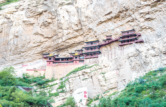 远远望去,有“天上寺院”之称的悬空寺像玲珑剔透的浮雕镶嵌在万仞峭壁间。近看悬空寺,大有凌空欲飞之势。整个寺院上载危崖,下临深谷,在一百多平方米的面积上,建筑有40间大小阁殿,之间用曲折回环的栈道连通。